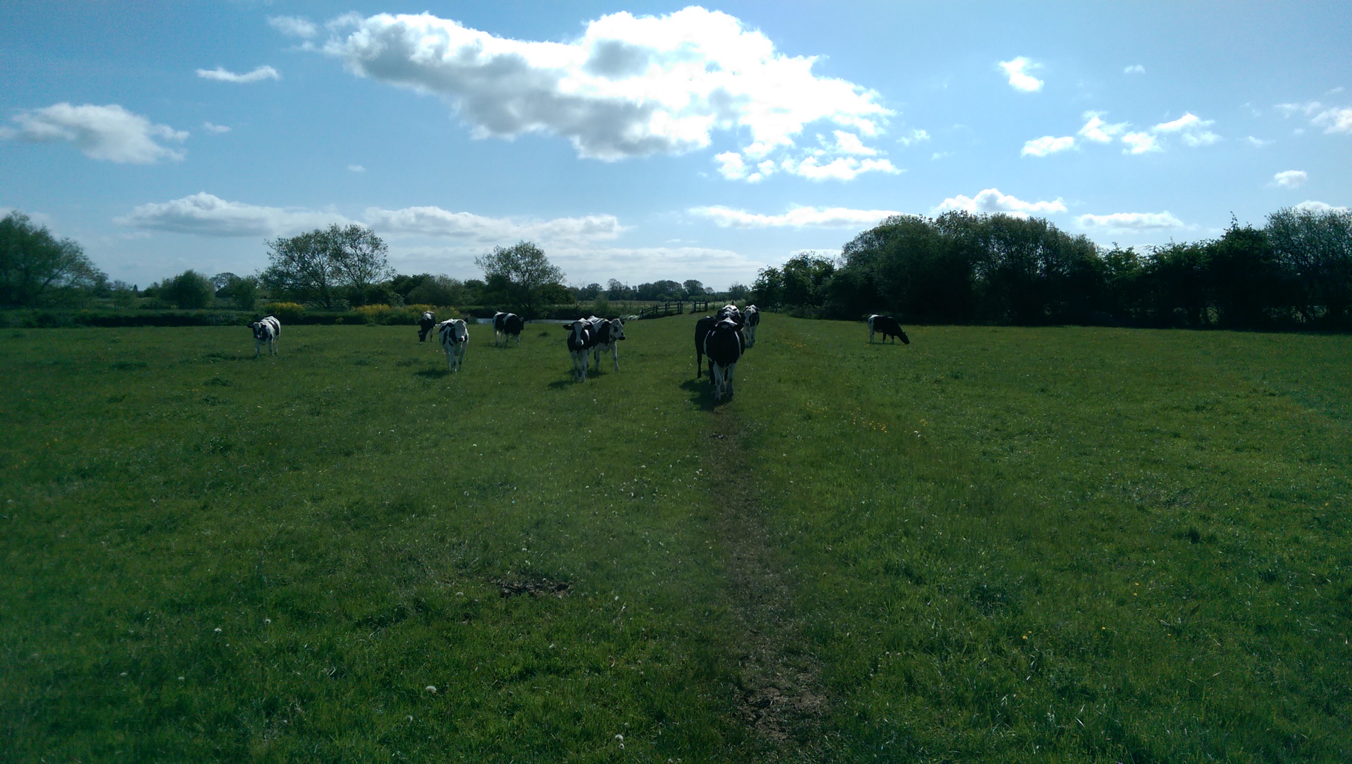 A heron flapped its way into the air then glided serenely across the field in front of me. This was the calm before the storm – as I turned the next corner I came across a herd of cows. If you have been following this odyssey from the early legs you will know that cows and I do not get on. But these seemed fairly relaxed; there was one group hanging around under the trees and another by the river. They were all staring at me, but that’s what cows do. I passed the river group and some of them started walking along the path behind me. Nothing to worry about, I reasoned, they’re probably just going to see their friends by the trees. But they carried on past the tree group and kept following me.